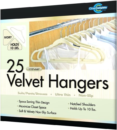 Closet Complete America's Favorite Brand brings quality, luxury and value to the care of all of your suits with our 25-piece IVORY Ultra Thin No Slip Velvet Suit Hanger. Contoured shoulders protect your suits' shape and fabric, notches hold accessories securely. The no-slip velvet feel holds clothes securely and prevents slipping. Durable construction, thin space saving design maximizes closet space.